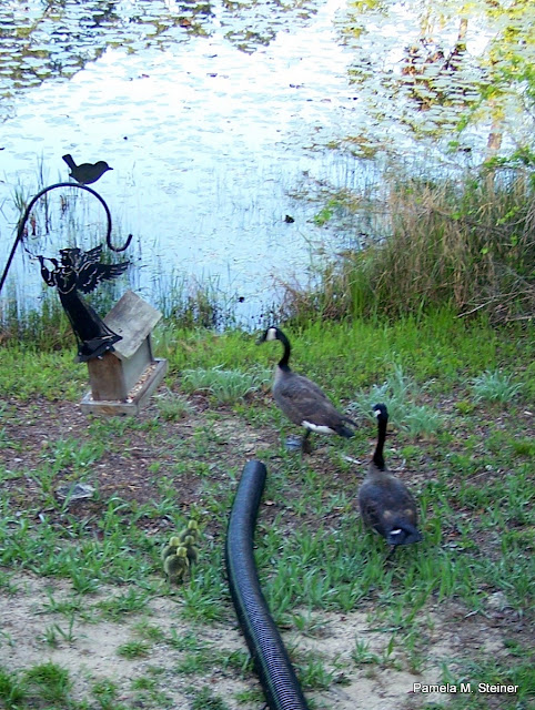 After lunch we saw them in the back yard again, but didn't notice anything unusual at that time. However, in a little while we looked out and saw them going back into the pond, but we could only see three baby goslings!
